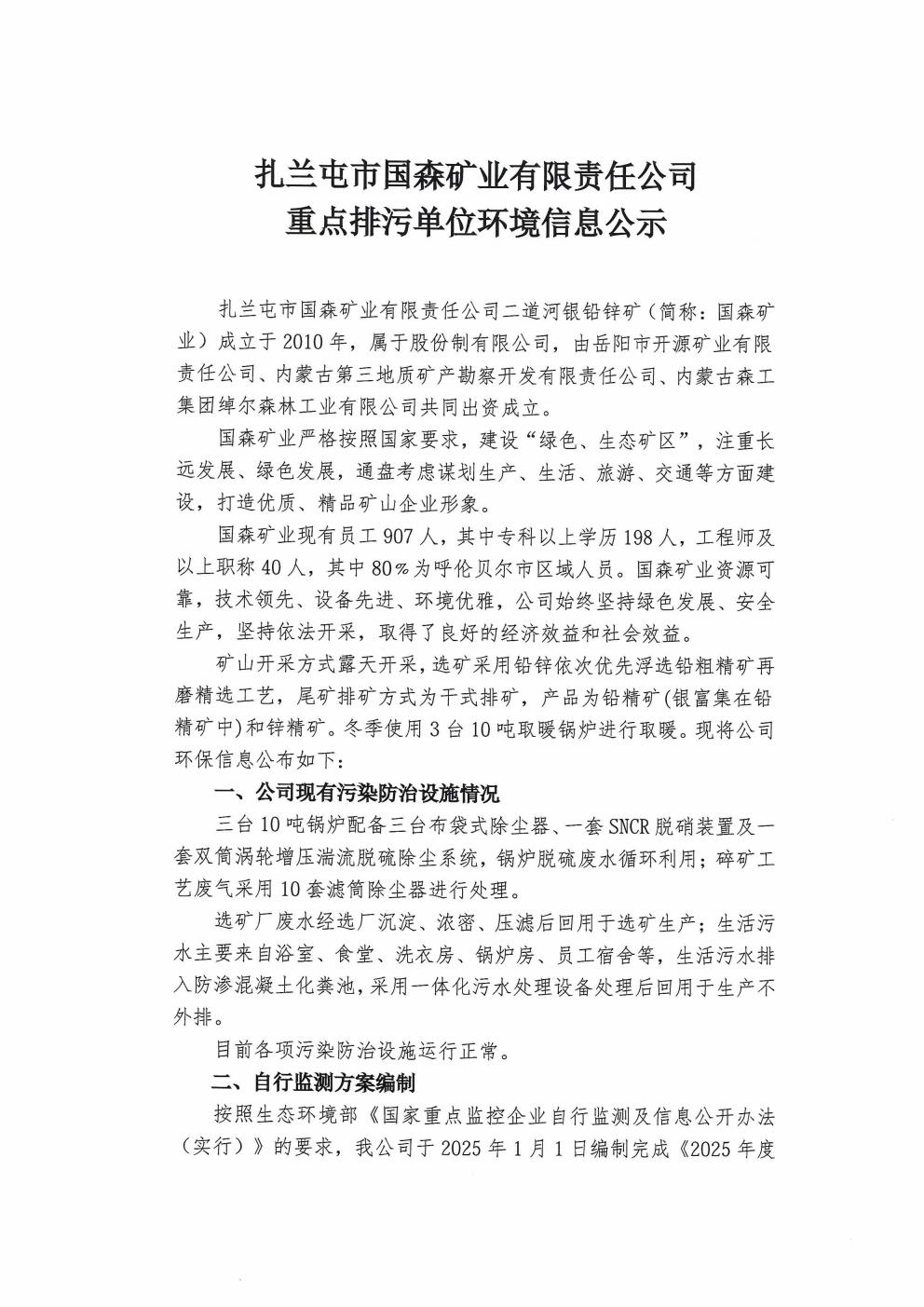 扎蘭屯市國森礦業有限責任公司 重點排污單位環境信息公示