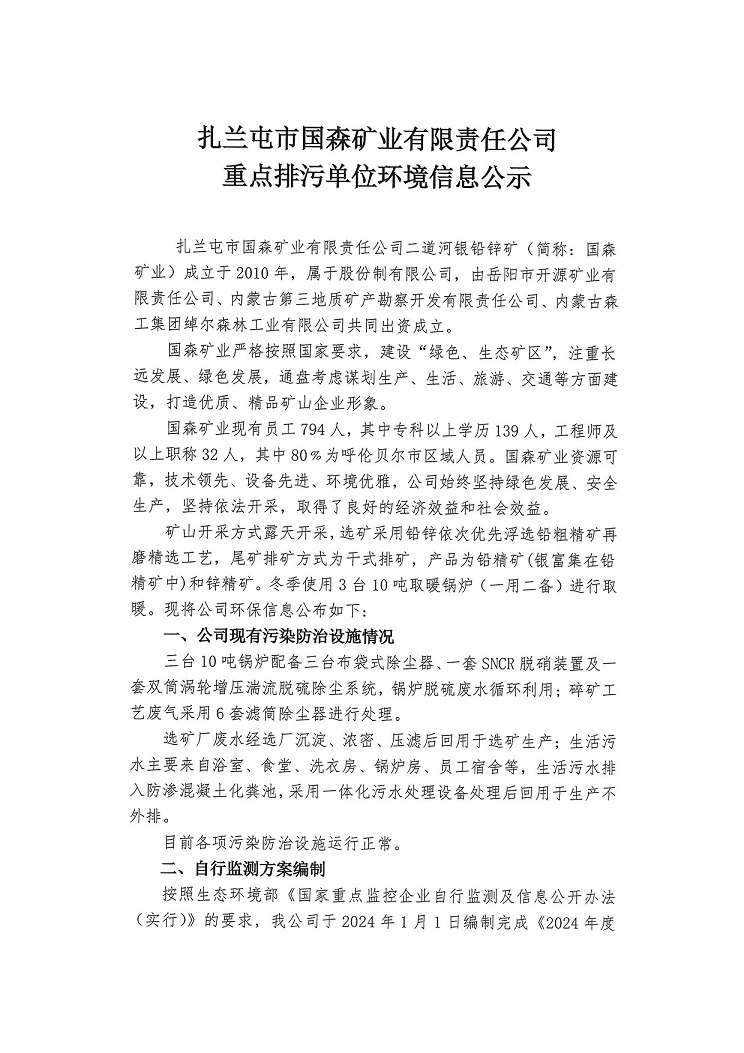 扎蘭屯市國森礦業有限責任公司重點排污單位環境信息公示